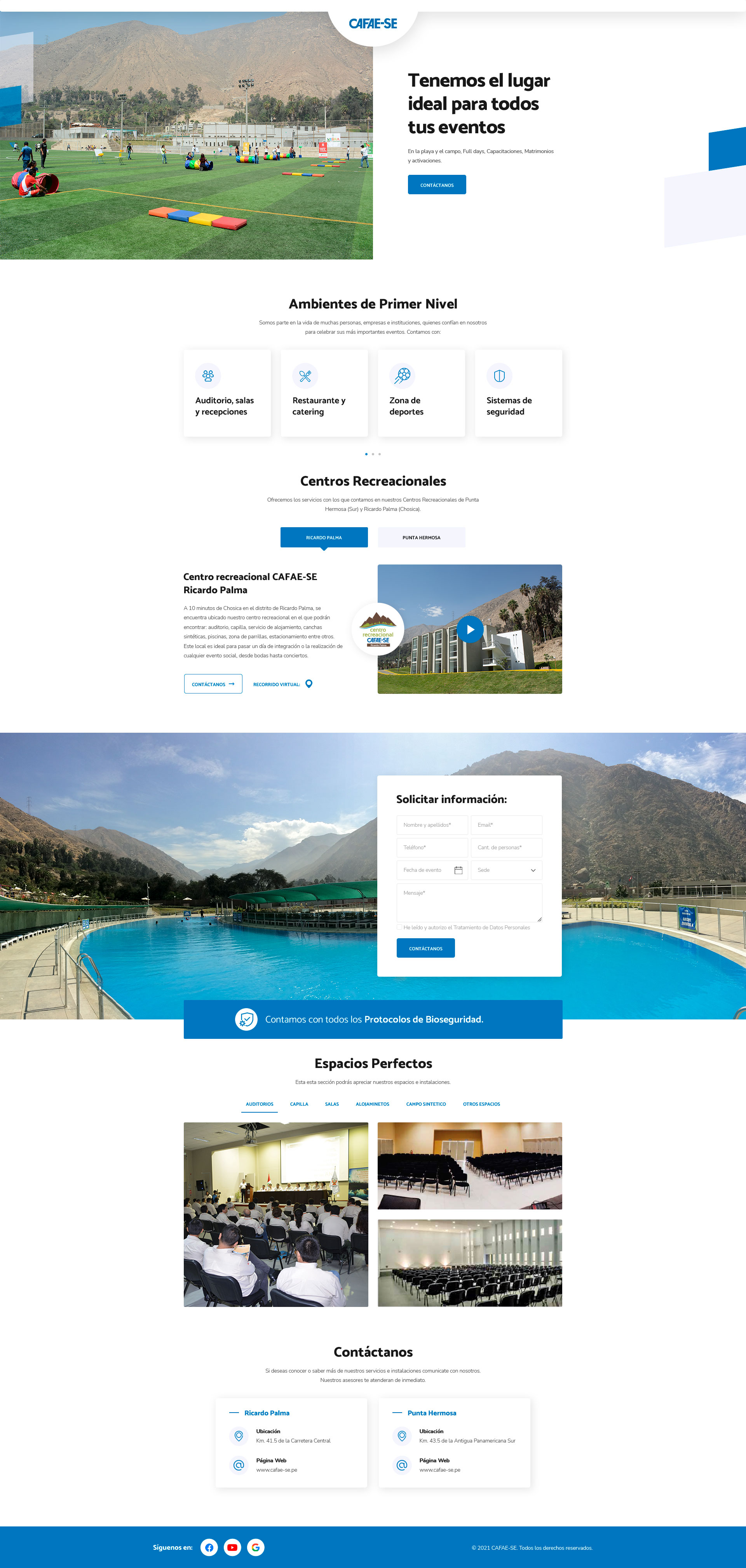 A minutos de Lima encuentras bungalows, canchas deportivas, piscinas, parrillas, canchas de gras artificial espacio ideal para eventos institucionales, paseos escolares, fiestas, aniversarios y matrimonios para lo cual contamos con capilla. Para sus capacitaciones lo cual contamos con capilla. Para sus capacitaciones 350 personas totalmente equipada y con WiFi, aire acondicionado y equipos de audio y video de última generación.